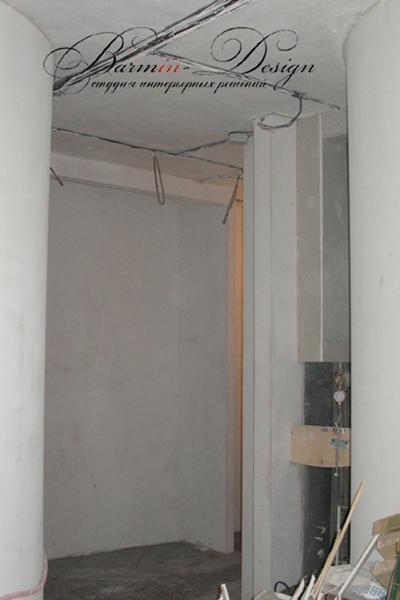 Специфика коридора выражалась в сложной геометрической форме, окружностями и наличием технических устройств жизнеобеспечения квартиры.