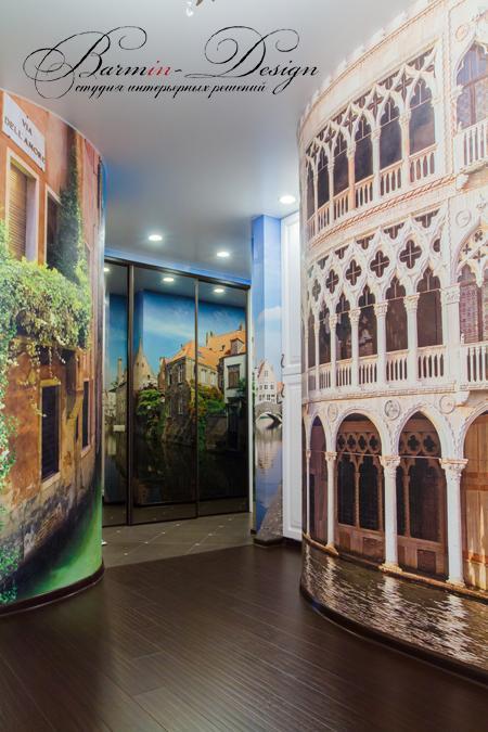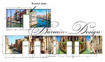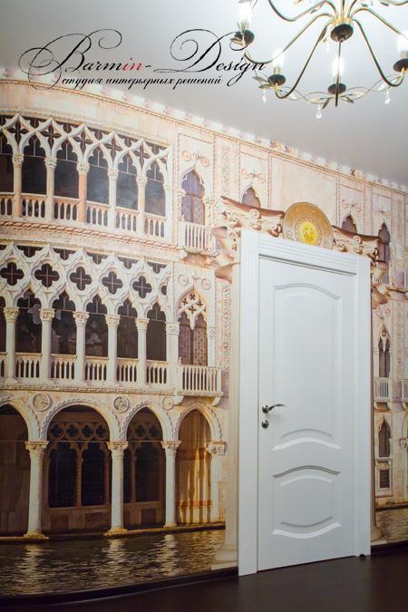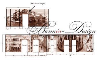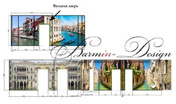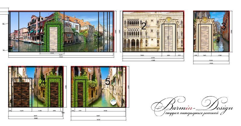 Наши дизайнеры выполнили подборку на тему Венеция, скомпоновали и предложили заказчице несколько вариантов. В процессе работы готовый коллаж претерпевал изменения и доработки. Для того чтобы двери полностью отвечали иллюзии входа, было принято решение использовать озелененные улицы Венеции в сочетании с озелененными дверями, а архитектурные мотивы улиц в сочетании с колоннадой обрамляли двери.