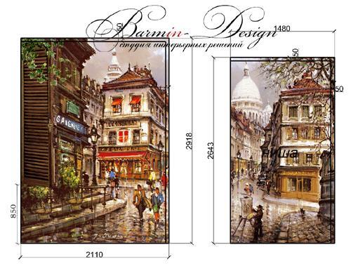 В этом довольно узком помещении две стены располагались под углом друг другу, разделенные дверным проемом. Поэтому и сюжет улицы пришлось разделить на левую и правую часть картины, сохранив все элементы единого изображения.