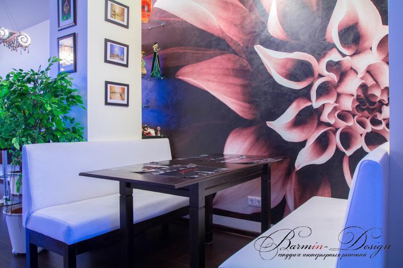В оформлении квартиры использовались: экологически чистые фотообои, оформление картинами с французской натяжкой, фотопанно на стекле, постеры и зеркала в рамах.