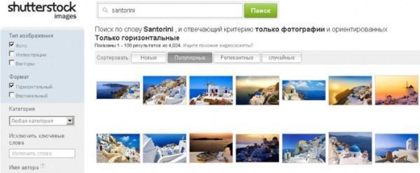 ПРИМЕР: хотим найти горизонтальную фотографию красивого греческого острова Санторини. Набираем Santorini. Уточняем поиск — в левом вертикальном блоке ставим галочки напротив «фото» и «горизонтальные». Жмем кнопку «поиск». Получаем более 4 тысяч изображений.